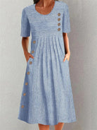 The three-quarter sleeves offer airy coverage of the upper arms, and the smooth midi length provides just the right balance between comfort and elegance.