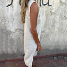 The Anaïs dress is perfect for your active summer days. Its sleeveless cut, flattering V-neckline, and decorative buttons make it a garment that is as functional as it is feminine. The side pockets add a practical touch while maintaining a chic and natural appearance.
