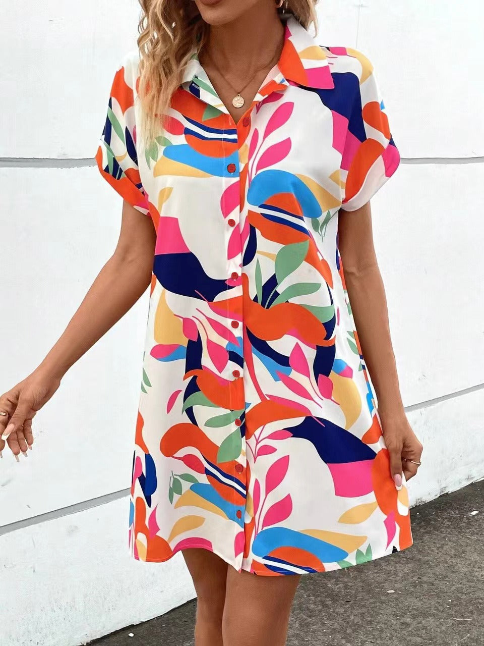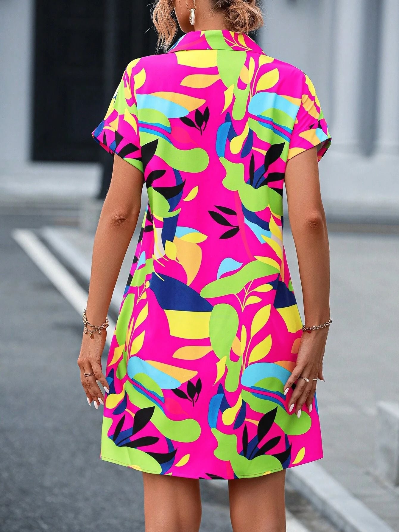 Its playful button-down design and bold artistic print make it a statement piece that feels light, airy, and easy to wear from morning coffee to evening drinks.